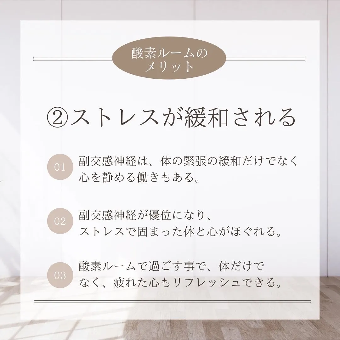 ルーム内で大量の酸素を取り入れることにより、脳への血流が増え、副交感神経が優位になります。