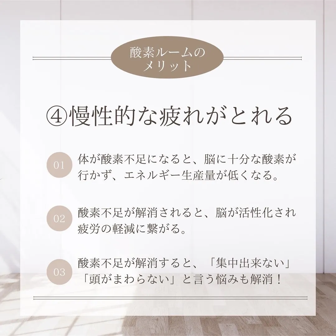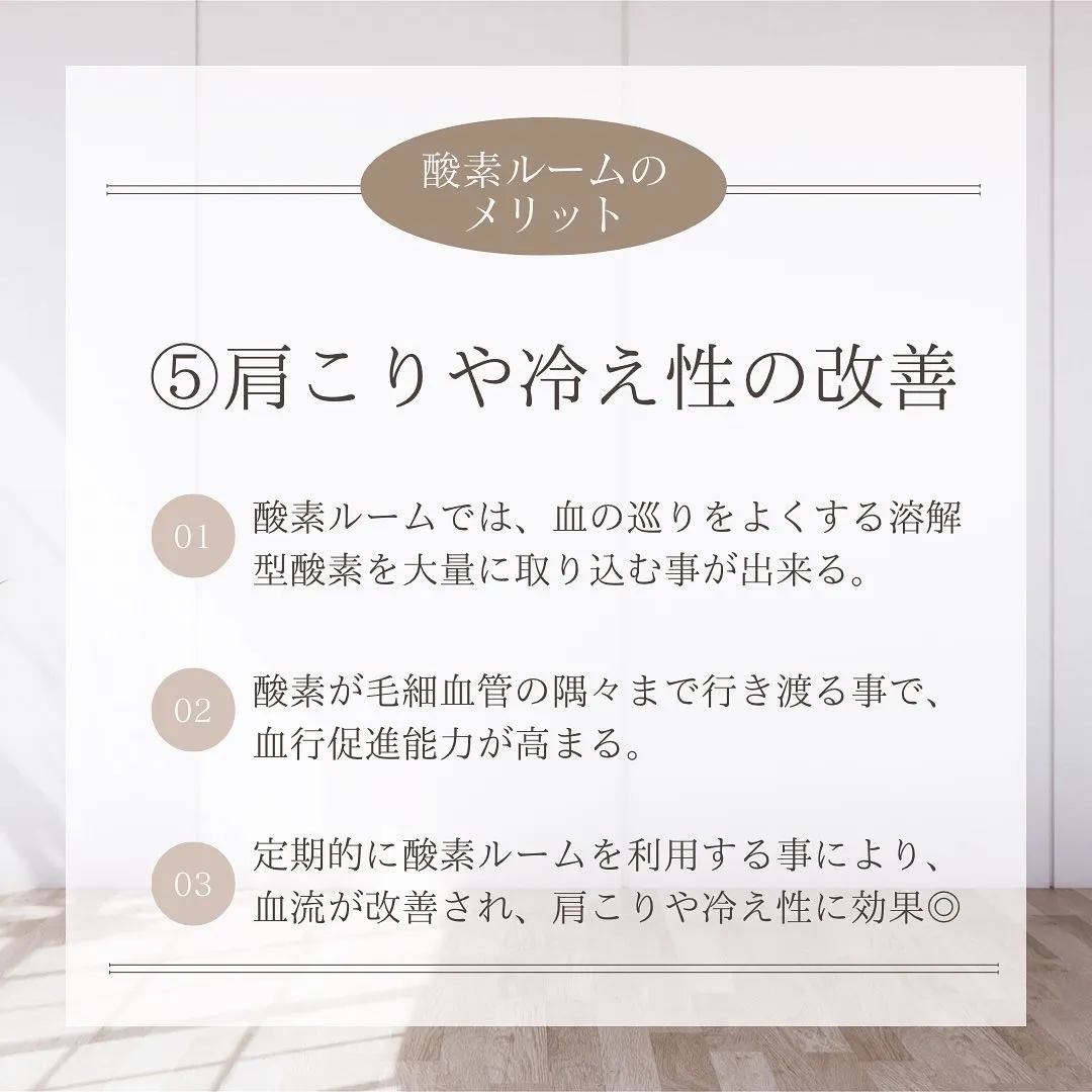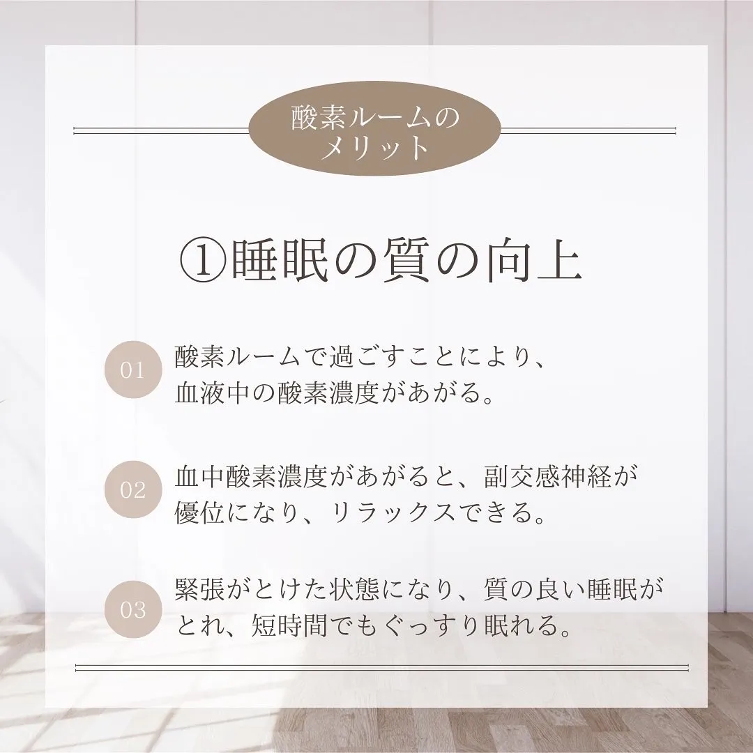酸素ルームでは高濃度の酸素を効率よく体内に取り入れることができ、毛細血管の隅々まで酸素を届けることができるので、血流改善、自律神経の安定、睡眠改善、新陳代謝アップなどの効果が期待できます。