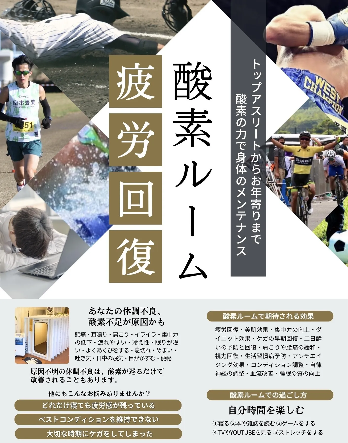 酸素には体に溜まった乳酸を分解し、体外へ除去してくれる働きがあり、早く疲労を回復することができます。
